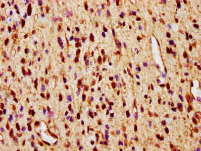 IHC image of CSB-PA618998LA01HU diluted at 1:600 and staining in paraffin-embedded human glioma performed on a Leica BondTM system. After dewaxing and hydration, antigen retrieval was mediated by high pressure in a citrate buffer (pH 6.0). Section was blocked with 10% normal goat serum 30min at RT. Then primary antibody (1% BSA) was incubated at 4°C overnight. The primary is detected by a biotinylated secondary antibody and visualized using an HRP conjugated SP system.