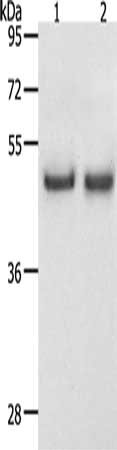 Gel: 12%SDS-PAGE, Lysate: 40 μg, Lane 1-2: Hela cells, K562 cells, Primary antibody: CSB-PA989865(SPAG4 Antibody) at dilution 1/1100, Secondary antibody: Goat anti rabbit IgG at 1/8000 dilution, Exposure time: 30 seconds