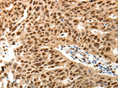 The image on the left is immunohistochemistry of paraffin-embedded Human ovarian cancer tissue using CSB-PA807056(SPATA2L Antibody) at dilution 1/30, on the right is treated with fusion protein. (Original magnification: ×200)
