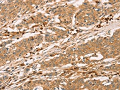 The image on the left is immunohistochemistry of paraffin-embedded Human gastric cancer tissue using CSB-PA985242(SPN Antibody) at dilution 1/60, on the right is treated with fusion protein. (Original magnification: ×200)
