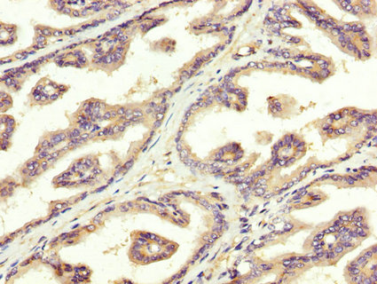 • IHC image of CSB-PA022657LA01HU diluted at 1:300 and staining in paraffin-embedded human prostate tissue performed on a Leica BondTM system. After dewaxing and hydration, antigen retrieval was mediated by high pressure in a citrate buffer (pH 6.0). Section was blocked with 10% normal goat serum 30min at RT. Then primary antibody (1% BSA) was incubated at 4°C overnight. The primary is detected by a biotinylated secondary antibody and visualized using an HRP conjugated SP system.