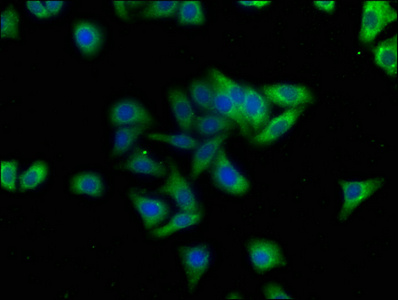 • Immunofluorescence staining of HepG2 cells with CSB-PA857006LA01HU at 1:100, counter-stained with DAPI. The cells were fixed in 4% formaldehyde, permeabilized using 0.2% Triton X-100 and blocked in 10% normal Goat Serum. The cells were then incubated with the antibody overnight at 4°C. The secondary antibody was Alexa Fluor 488-congugated AffiniPure Goat Anti-Rabbit IgG(H+L).