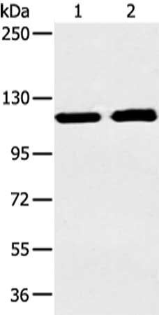 • Gel: 6%SDS-PAGE, Lysate: 40 μg, Lane 1-2: Human mucinous type of soft tissue sarcoma and human fetal liver tissue, Primary antibody: CSB-PA199893(TERT Antibody) at dilution 1/250 dilution, Secondary antibody: Goat anti rabbit IgG at 1/8000 dilution, Exposure time: 1 minute