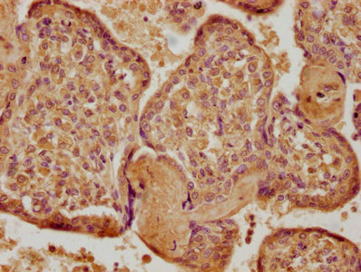 IHC image of CSB-PA023438LA01HU diluted at 1:400 and staining in paraffin-embedded human placenta tissue performed on a Leica BondTM system. After dewaxing and hydration, antigen retrieval was mediated by high pressure in a citrate buffer (pH 6.0). Section was blocked with 10% normal goat serum 30min at RT. Then primary antibody (1% BSA) was incubated at 4°C overnight. The primary is detected by a biotinylated secondary antibody and visualized using an HRP conjugated SP system.