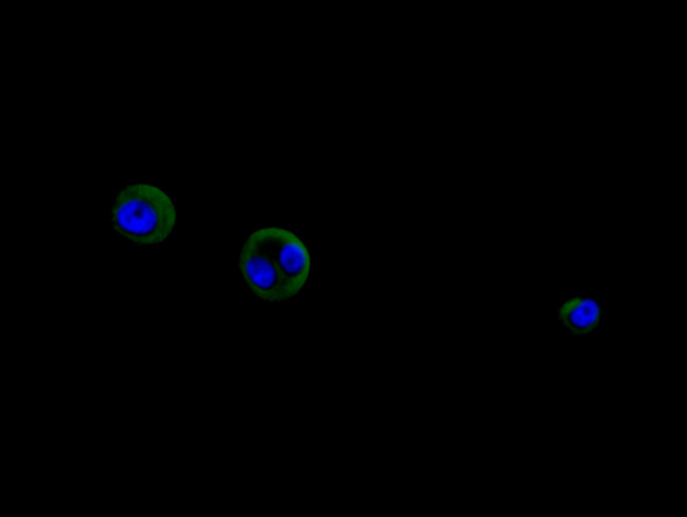 • Immunofluorescence staining of A549 cell with 5% goat serum, counter-stained with DAPI. The cells were fixed in 4% formaldehyde and blocked in 10% normal Goat Serum. The cells were then incubated with the antibody overnight at 4C. The secondary antibody was Alexa Fluor 488-congugated AffiniPure Goat Anti-Rabbit IgG(H+L).