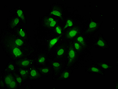 • Immunofluorescence staining of Hela cells with CSB-PA010429OA91nforHU at 1:2.5, counter-stained with DAPI. The cells were fixed in 4% formaldehyde, permeabilized using 0.2% Triton X-100 and blocked in 10% normal Goat Serum. The cells were then incubated with the antibody overnight at 4°C. The secondary antibody was Alexa Fluor 488-congugated AffiniPure Goat Anti-Rabbit IgG(H+L).