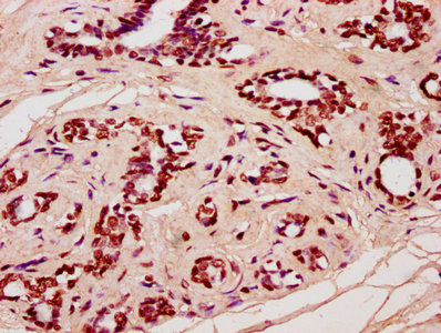 • IHC image of CSB-PA010429OA91nforHU diluted at 1:20 and staining in paraffin-embedded human breast cancer performed on a Leica BondTM system. After dewaxing and hydration, antigen retrieval was mediated by high pressure in a citrate buffer (pH 6.0). Section was blocked with 10% normal goat serum 30min at RT. Then primary antibody (1% BSA) was incubated at 4°C overnight. The primary is detected by a biotinylated secondary antibody and visualized using an HRP conjugated SP system.