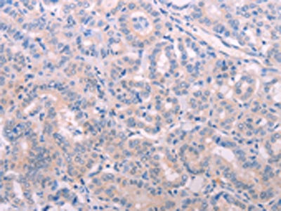 • The image on the left is immunohistochemistry of paraffin-embedded Human thyroid cancer tissue using CSB-PA188746(TIMP4 Antibody) at dilution 1/15, on the right is treated with fusion protein. (Original magnification: ×200)