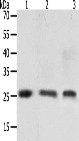 • Gel: 8+12%SDS-PAGE, Lysate: 50 μg, Lane 1-3: Human brain tissue, PC3 cells, hela cells, Primary antibody: CSB-PA188746(TIMP4 Antibody) at dilution 1/200, Secondary antibody: Goat anti rabbit IgG at 1/8000 dilution, Exposure time: 30 seconds