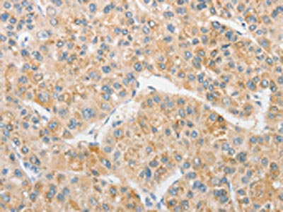 • The image on the left is immunohistochemistry of paraffin-embedded Human liver cancer tissue using CSB-PA296982(TLR5 Antibody) at dilution 1/30, on the right is treated with fusion protein. (Original magnification: ×200)