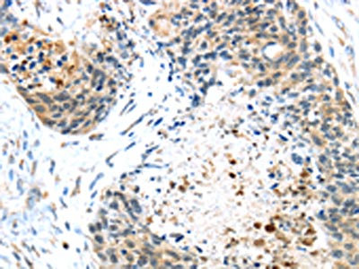 • The image on the left is immunohistochemistry of paraffin-embedded Human esophagus cancer tissue using CSB-PA034529(TMPRSS4 Antibody) at dilution 1/45, on the right is treated with fusion protein. (Original magnification: ×200)