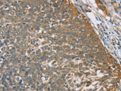 The image on the left is immunohistochemistry of paraffin-embedded Human cervical cancer tissue using CSB-PA057438(TNFRSF10D Antibody) at dilution 1/40, on the right is treated with fusion protein. (Original magnification: ×200)
