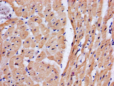 IHC image of CSB-PA10047A0Rb diluted at 1:200 and staining in paraffin-embedded human heart tissue performed on a Leica BondTM system. After dewaxing and hydration, antigen retrieval was mediated by high pressure in a citrate buffer (pH 6.0). Section was blocked with 10% normal goat serum 30min at RT. Then primary antibody (1% BSA) was incubated at 4°C overnight. The primary is detected by a biotinylated secondary antibody and visualized using an HRP conjugated SP system.