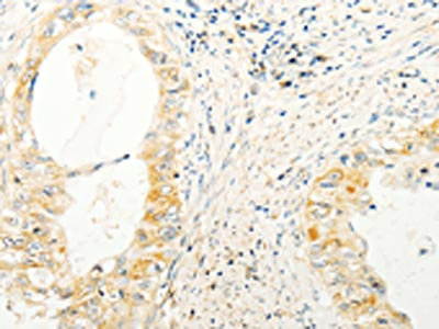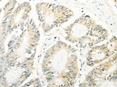 The image on the left is immunohistochemistry of paraffin-embedded Human colon cancer tissue using CSB-PA445195(TRAF1 Antibody) at dilution 1/20, on the right is treated with fusion protein. (Original magnification: ×200)