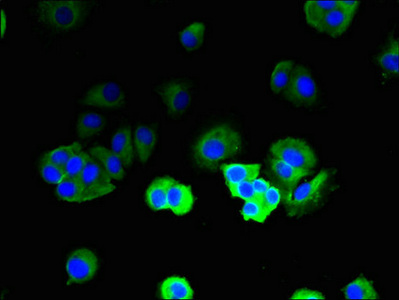 Immunofluorescent analysis of MCF-7 cells using CSB-PA024291LA01HU at dilution of 1:100 and Alexa Fluor 488-congugated AffiniPure Goat Anti-Rabbit IgG(H+L)