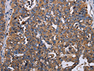 • The image on the left is immunohistochemistry of paraffin-embedded Human ovarian cancer tissue using CSB-PA110299(TRIM13 Antibody) at dilution 1/30, on the right is treated with fusion protein. (Original magnification: ×200)