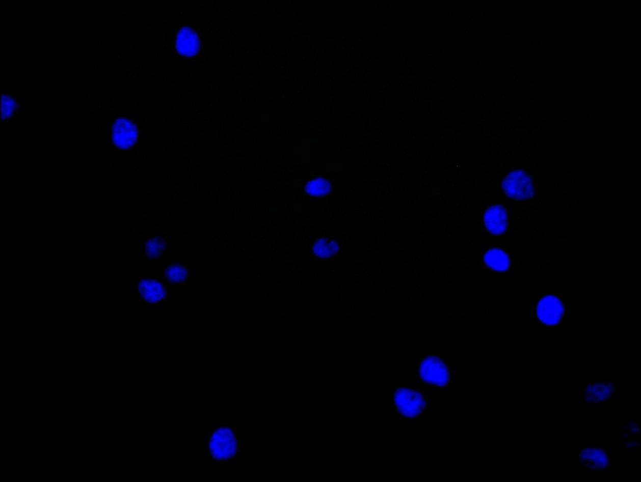 • Immunofluorescence staining of Hela cell with 5% goat serum, counter-stained with DAPI. The cells were fixed in 4% formaldehyde and blocked in 10% normal Goat Serum. The cells were then incubated with the antibody overnight at 4C. The secondary antibody was Alexa Fluor 488-congugated AffiniPure Goat Anti-Rabbit IgG(H+L).