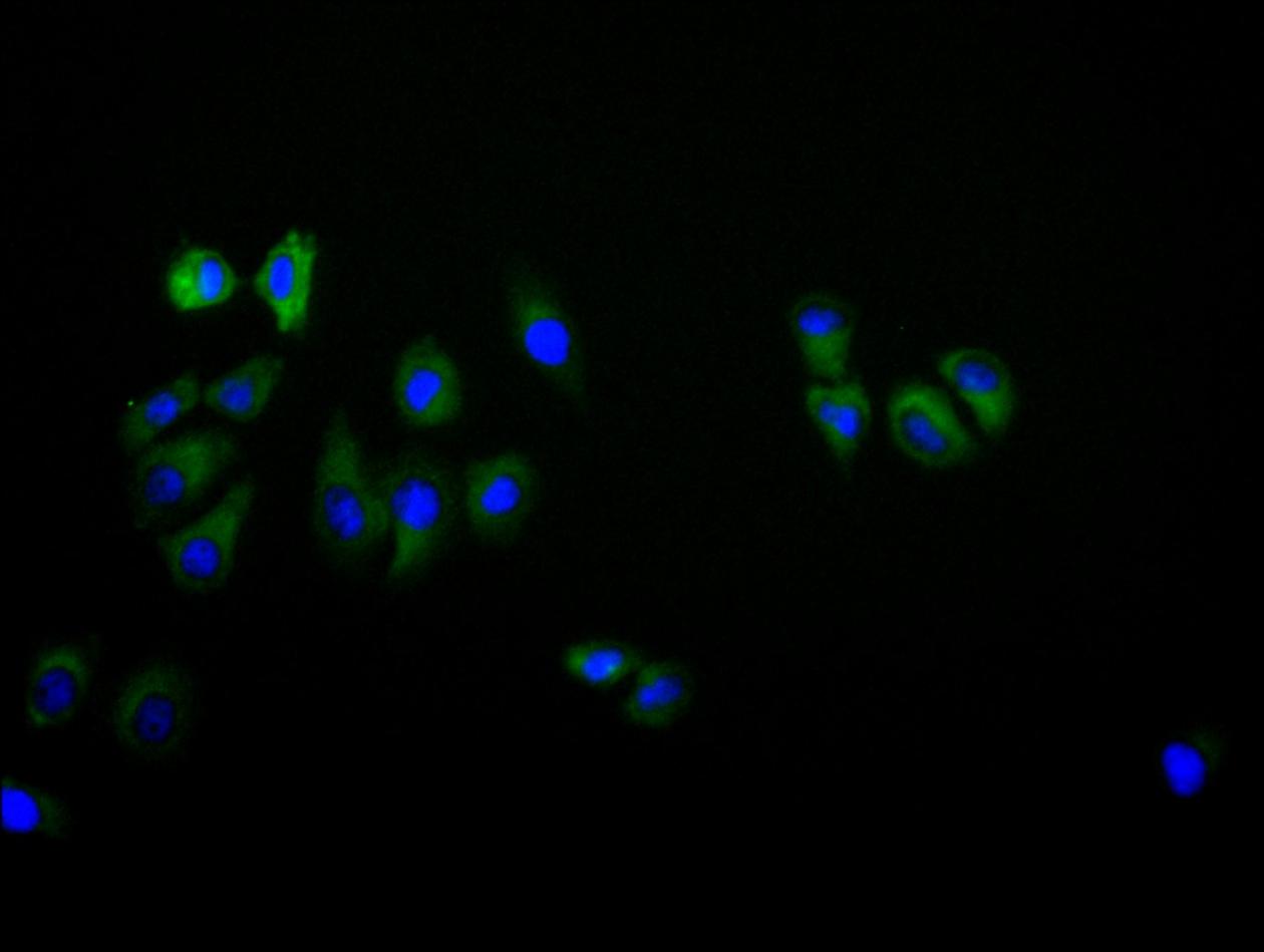 • Immunofluorescence staining of Hela cell with CSB-PA867139LA01HU at 1:30, counter-stained with DAPI. The cells were fixed in 4% formaldehyde and blocked in 10% normal Goat Serum. The cells were then incubated with the antibody overnight at 4C. The secondary antibody was Alexa Fluor 488-congugated AffiniPure Goat Anti-Rabbit IgG(H+L).