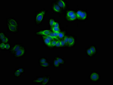 • Immunofluorescent analysis of HepG2 cells using CSB-PA03879A0Rb at dilution of 1:100 and Alexa Fluor 488-congugated AffiniPure Goat Anti-Rabbit IgG(H+L)