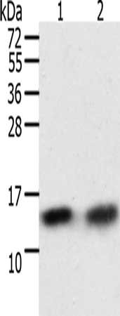 Gel: 12%SDS-PAGE, Lysate: 40 μg, Lane 1-2: A172 cells, hela cells, Primary antibody: CSB-PA973727(TXN Antibody) at dilution 1/300, Secondary antibody: Goat anti rabbit IgG at 1/8000 dilution, Exposure time: 10 seconds