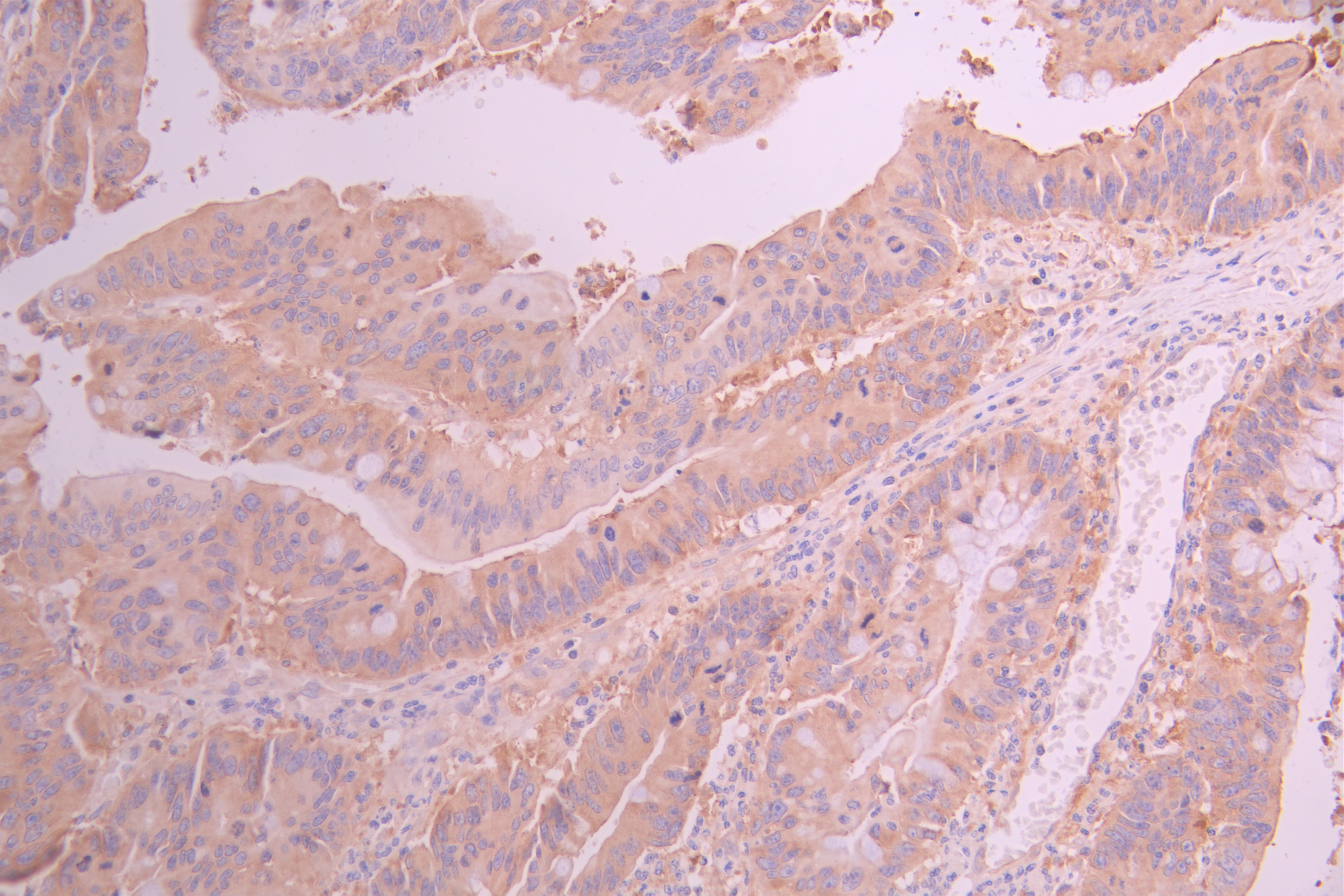 IHC image of CSB-RA559722A0HU diluted at 1:100 and staining in paraffin-embedded human colorectal cancer performed on a Leica BondTM system. After dewaxing and hydration, antigen retrieval was mediated by high pressure in a citrate buffer (pH 6.0). Section was blocked with 10% normal goat serum 30min at RT. Then primary antibody (1% BSA) was incubated at 4°C overnight. The primary is detected by a Goat anti-rabbit polymer IgG labeled by HRP and visualized using 0.05% DAB.