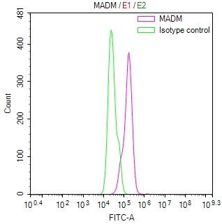Overlay Peak curve showing Hela cells stained with CSB-RA001273MA1HU (red line) at 1:400. The cells were fixed in 4% formaldehyde (15min) and permeated by 0.2% TritonX-100 for 10min. Then 10% normal goat serum was Incubated to block non-specific protein-protein interactions followed by the antibody (1μg/1*106cells) for 45 min at 4°C. The secondary antibody used was FITC-conjugated Goat Anti-Mouse IgG(H+L) at 1/200 dilution for 35 min at 4°C. Isotype control antibody (green line) was mouse IgG1 (1μg/1*106cells) used under the same conditions. Acquisition of >10, 000 events was performed.