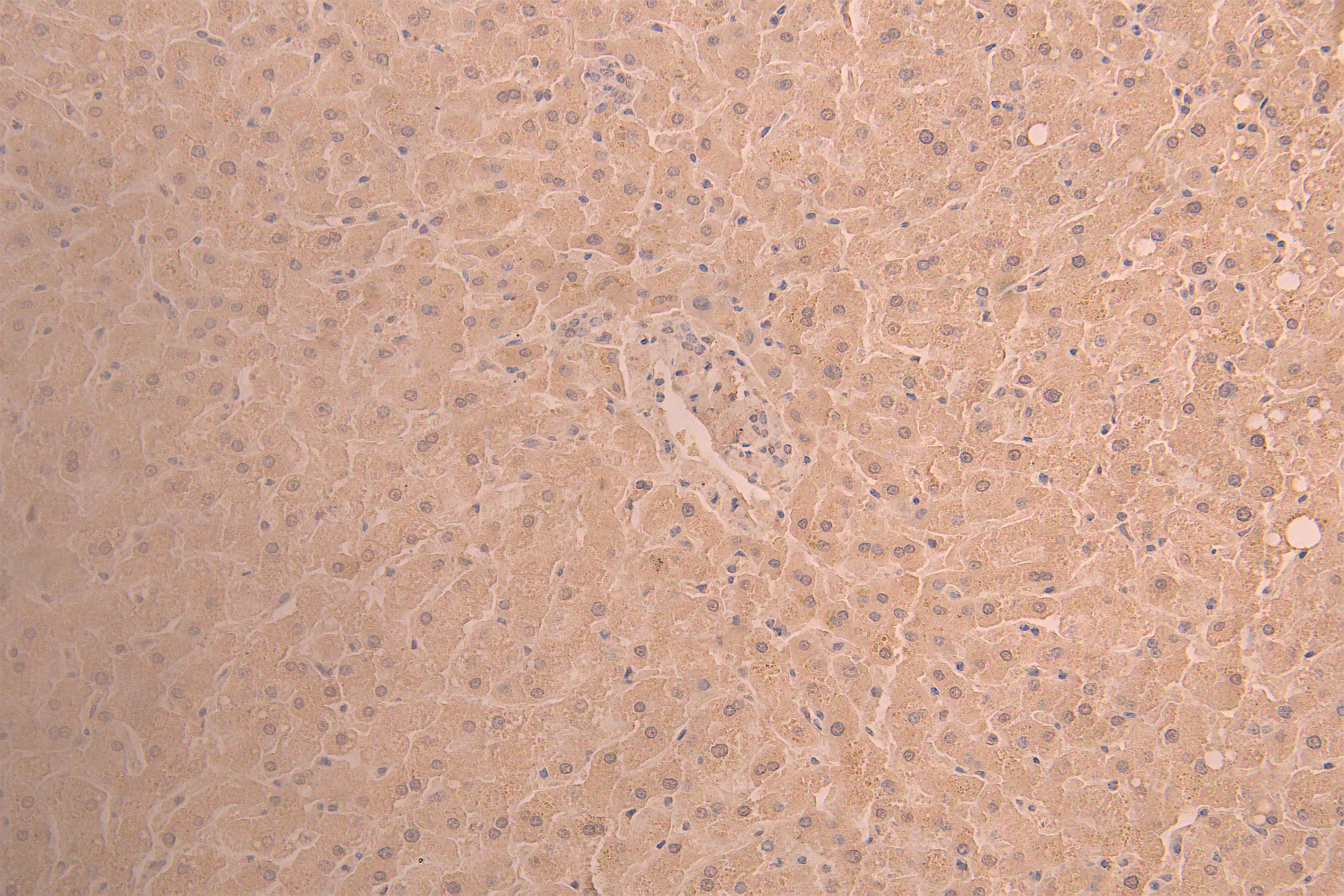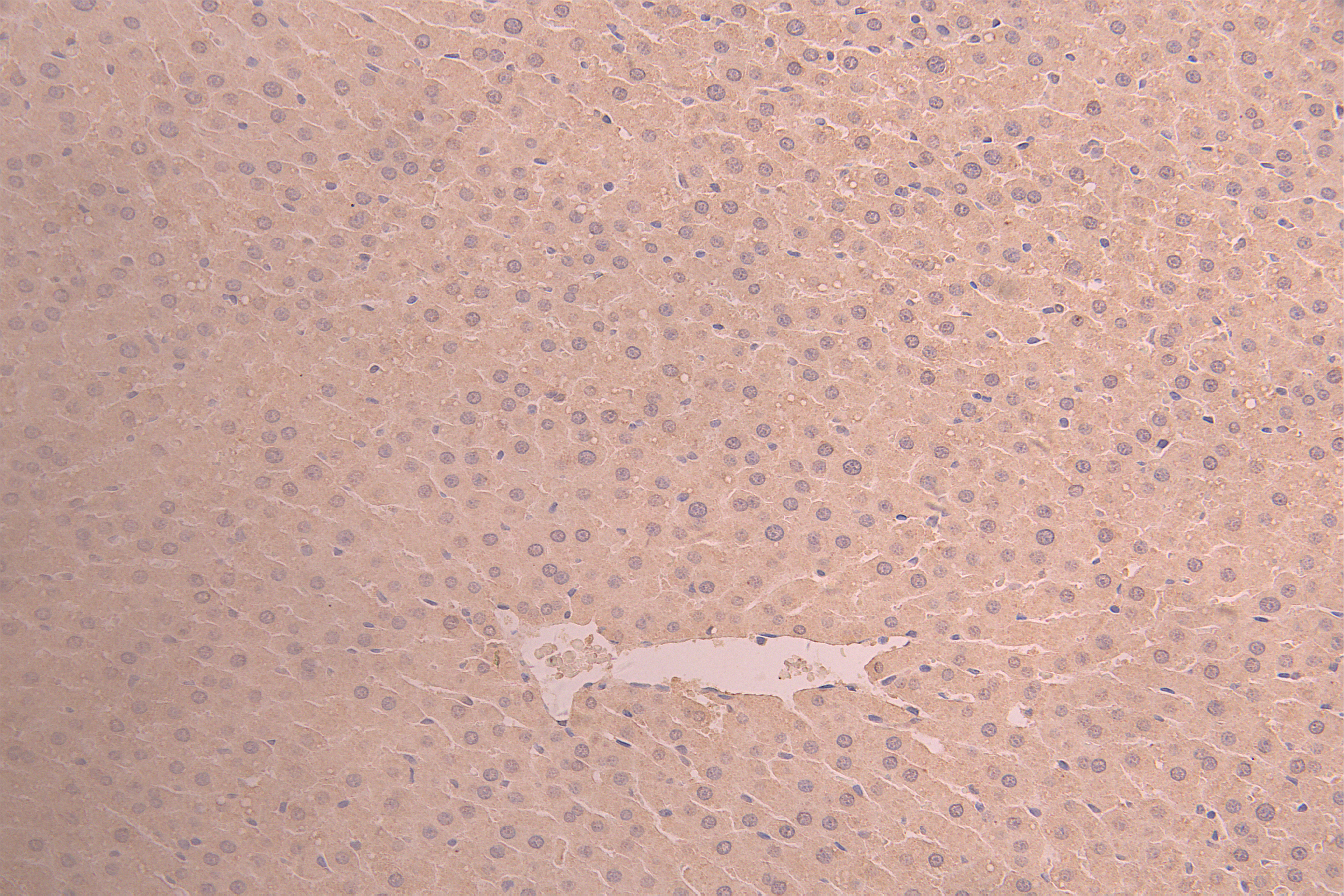 IHC image of CSB-RA001703MA1HU diluted at 1:50 and staining in paraffin-embedded mouse liver tissue performed on a Leica BondTM system. After dewaxing and hydration, antigen retrieval was mediated by high pressure in a citrate buffer (pH 6.0). Section was blocked with 10% normal goat serum 30min at RT. Then primary antibody (1% BSA) was incubated at 4°C overnight. The primary is detected by a Anti-Human lgG, Fcy Fragment Specific labeled by HRP and visualized using 0.05% DAB.