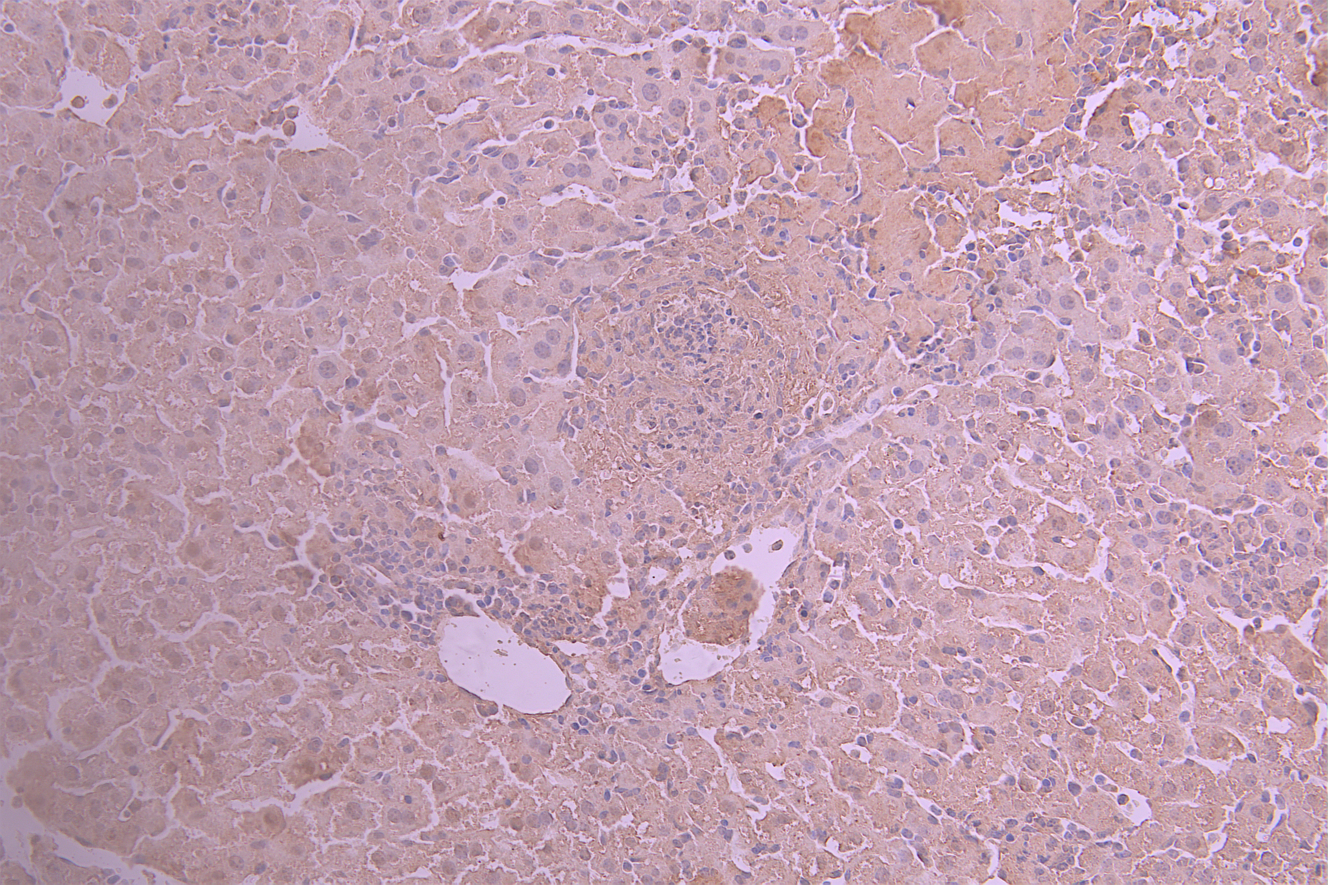 IHC image of CSB-RA001703MA1HU diluted at 1:50 and staining in paraffin-embedded human liver tissue performed on a Leica BondTM system. After dewaxing and hydration, antigen retrieval was mediated by high pressure in a citrate buffer (pH 6.0). Section was blocked with 10% normal goat serum 30min at RT. Then primary antibody (1% BSA) was incubated at 4°C overnight. The primary is detected by a Anti-Human lgG, Fcy Fragment Specific labeled by HRP and visualized using 0.05% DAB.