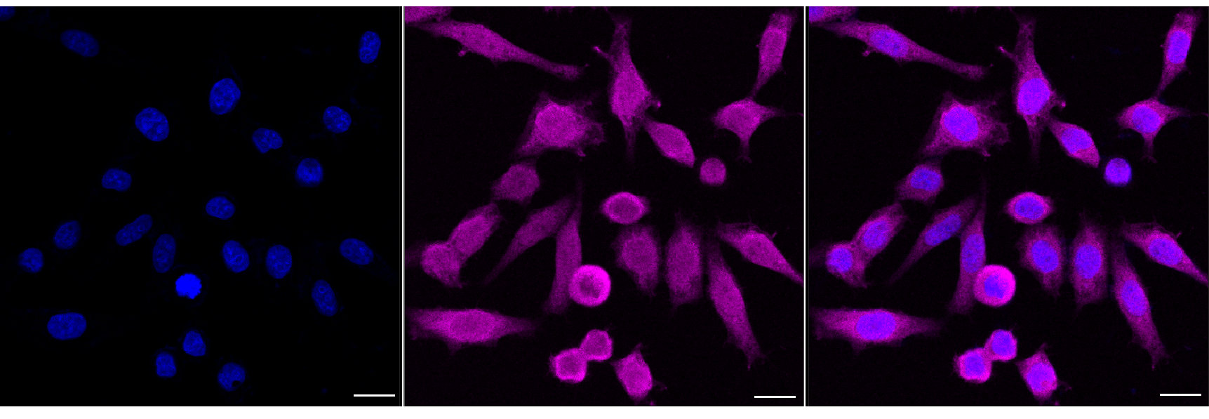 Immunocytochemical staining of HepG2 cells with Annexin A1 antibody. Nuclei were stained blue with DAPI; Annexin A1 was stained magenta with Alexa Fluor? 647. Images were taken using Leica stellaris 5. Protein abundance based on laser Intensity and smart gain: High. Scale bar, 20 μm.