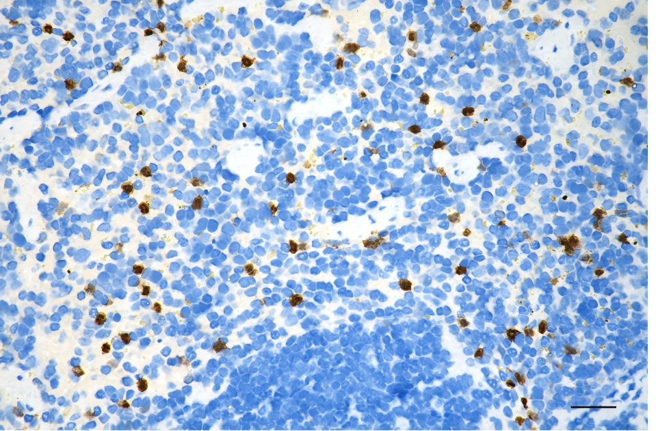Immunohistochemistry was performed on paraffin-embedded mouse spleen using annexin A1 antibody. Antigen retrieval was done in sodium citrate buffer (pH 6.0). DAB was used for detection, with hematoxylin counterstaining. Images were acquired using a Nikon Ci-L Plus microscope (40× objective). Scale bar: 25 μm.