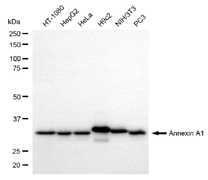 Western blotting analysis using annexin A1 antibody. Total cell lysates (30 μg) from various cell lines were loaded and separated by SDS-PAGE. The blot was incubated with annexin A1 antibody and HRP-conjugated goat anti-rabbit secondary antibody respectively.