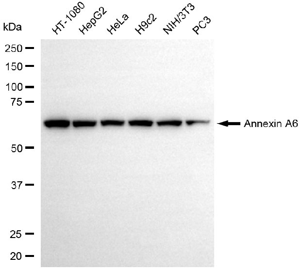 Western blotting analysis using annexin A6 antibody. Total cell lysates (20 μg) from various cell lines were loaded and separated by SDS-PAGE. The blot was incubated with annexin A6 antibody and HRP-conjugated goat anti-rabbit secondary antibody respectively.