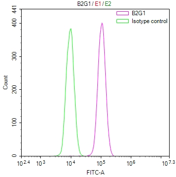 Overlay Peak curve showing HepG2 cells stained with CSB-RA001939MA1HU (red line) at 1:100. The cells were fixed in 4% formaldehyde and permeated by 0.2% TritonX-100 for 10min. Then 10% normal goat serum to block non-specific protein-protein interactions followed by the antibody (1ug/1*106cells) for 45min at 4℃. The secondary antibody used was Fluorescein (FITC) AffiniPure Goat Anti-Human IgG, Fcγ fragment specific at 1:200 dilution for 35min at 4℃.Control antibody (green line) was human IgG1 (1ug/1*106cells) used under the same conditions. Acquisition of >10,000 events was performed.