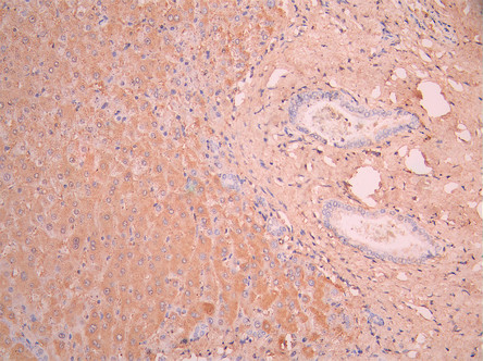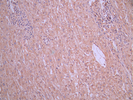 IHC image of CSB-RA001939MA1HU diluted at 1:50 and staining in paraffin-embedded human liver tissue performed on a Leica BondTM system. After dewaxing and hydration, antigen retrieval was mediated by high pressure in a citrate buffer (pH 6.0). Section was blocked with 10% normal goat serum 30min at RT. Then primary antibody (1% BSA) was incubated at 4°C overnight. The primary is detected by a Anti-Human lgG, Fcy Fragment Specific labeled by HRP and visualized using 0.05% DAB.