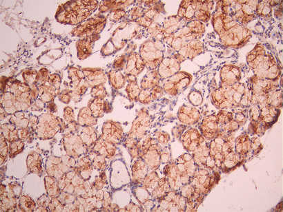 • IHC image of CSB-RA192672A0HU diluted at 1:100 and staining in paraffin-embedded human salivary gland tissue performed on a Leica BondTM system. After dewaxing and hydration, antigen retrieval was mediated by high pressure in a citrate buffer (pH 6.0). Section was blocked with 10% normal goat serum 30min at RT. Then primary antibody (1% BSA) was incubated at 4°C overnight. The primary is detected by a Goat anti-rabbit polymer IgG labeled by HRP and visualized using 0.05% DAB.