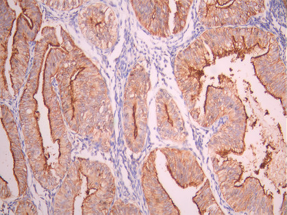 • IHC image of CSB-RA192672A0HU diluted at 1:100 and staining in paraffin-embedded human endometrial cancer performed on a Leica BondTM system. After dewaxing and hydration, antigen retrieval was mediated by high pressure in a citrate buffer (pH 6.0). Section was blocked with 10% normal goat serum 30min at RT. Then primary antibody (1% BSA) was incubated at 4°C overnight. The primary is detected by a Goat anti-rabbit polymer IgG labeled by HRP and visualized using 0.05% DAB.