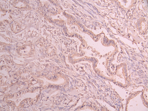 IHC image of CSB-RA044921A0HU diluted at 1:100 and staining in paraffin-embedded human cervical cancer performed on a Leica BondTM system. After dewaxing and hydration, antigen retrieval was mediated by high pressure in a citrate buffer (pH 6.0). Section was blocked with 10% normal goat serum 30min at RT. Then primary antibody (1% BSA) was incubated at 4°C overnight. The primary is detected by a Goat anti-rabbit polymer IgG labeled by HRP and visualized using 0.05% DAB.