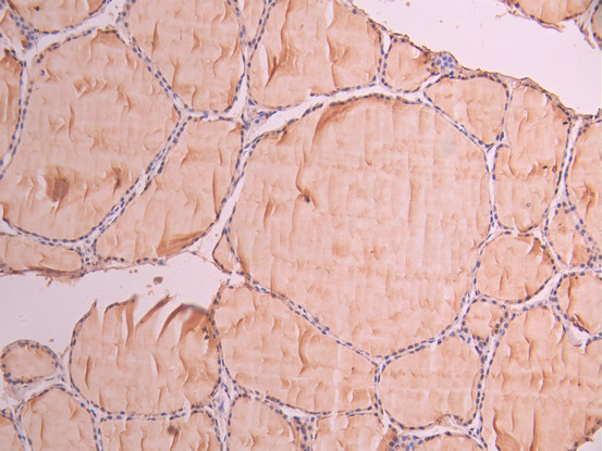 IHC image of CSB-RA044921A0HU diluted at 1:100 and staining in paraffin-embedded human thyroid tissue performed on a Leica BondTM system. After dewaxing and hydration, antigen retrieval was mediated by high pressure in a citrate buffer (pH 6.0). Section was blocked with 10% normal goat serum 30min at RT. Then primary antibody (1% BSA) was incubated at 4°C overnight. The primary is detected by a Goat anti-rabbit polymer IgG labeled by HRP and visualized using 0.05% DAB.