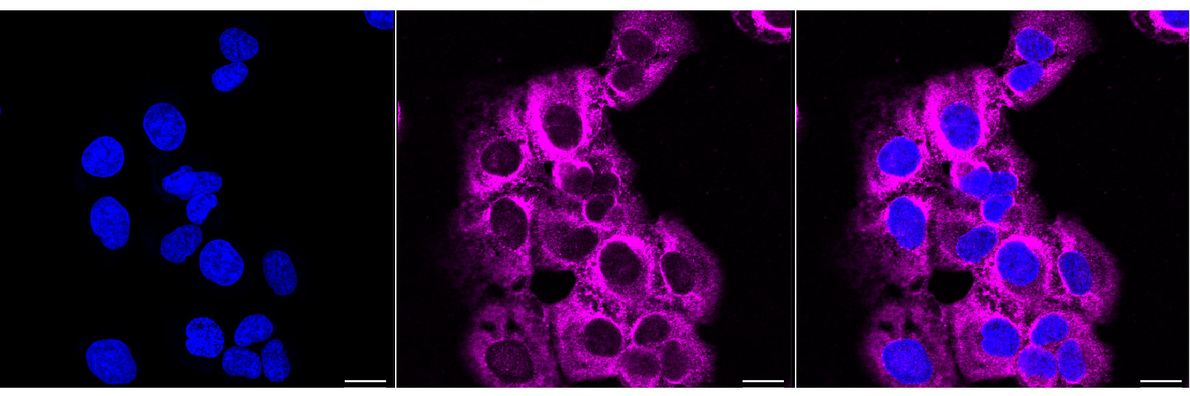 Immunocytochemical staining of HT-1080 cells with Arg2 antibody. Nuclei were stained blue with DAPI; Arg2 was stained magenta with Alexa Fluor? 647. Images were taken using Leica stellaris 5. Protein abundance based on laser Intensity and smart gain: Medium. Scale bar, 20 μm.