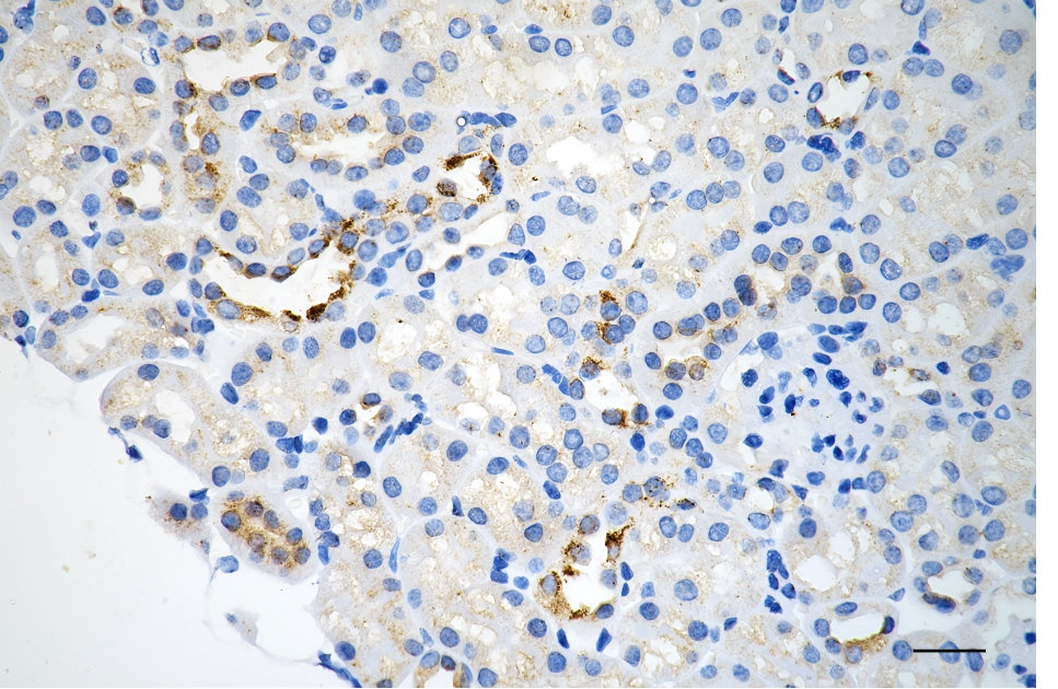 Immunohistochemistry was performed on paraffin-embedded mouse kidney using arg2 antibody. Antigen retrieval was done in sodium citrate buffer (pH 6.0). DAB was used for detection, with hematoxylin counterstaining. Images were acquired using a Nikon Ci-L Plus microscope (40× objective). Scale bar: 25 μm.