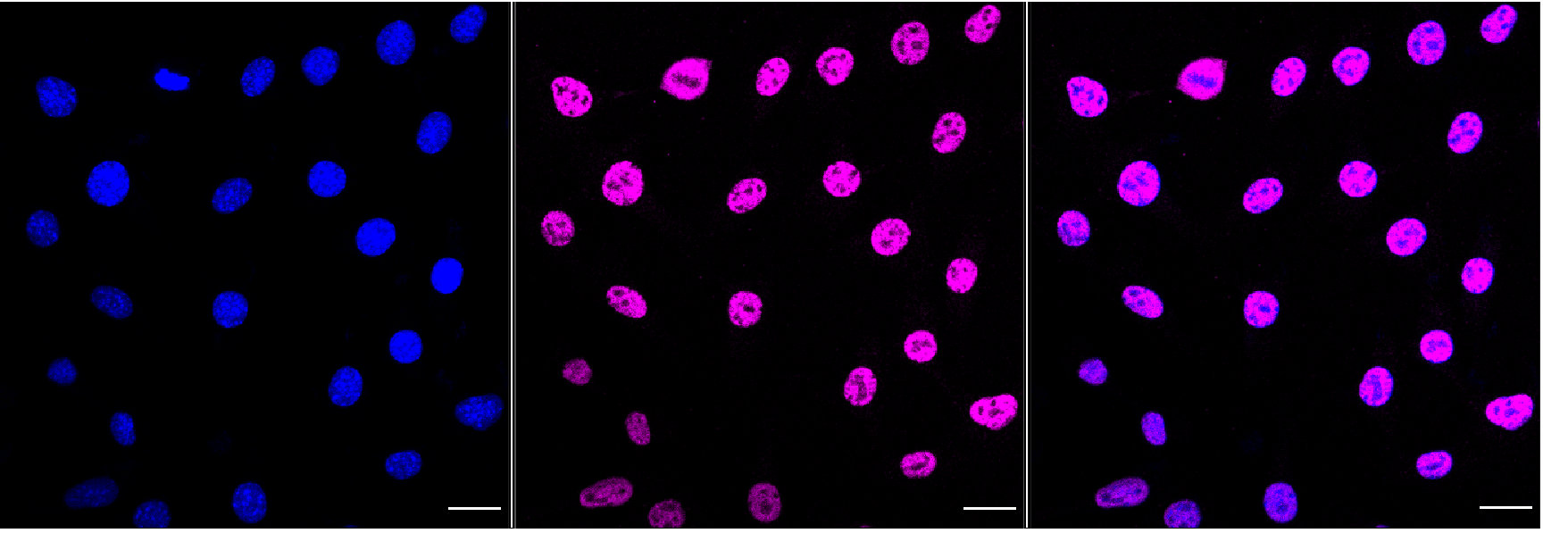 Immunocytochemical staining of C2C12 cells with ARID1A?antibody. Nuclei were stained blue with DAPI; ARID1A was stained magenta with Alexa Fluor? 647. Images were taken using Leica stellaris 5. Protein abundance based on laser Intensity and smart gain: Medium. Scale bar, 20 μm.