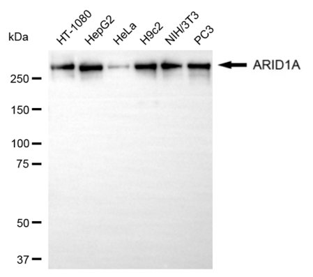 Western blotting analysis using ARID1A antibody. Total cell lysates (30 μg) from various cell lines were loaded and separated by SDS-PAGE. The blot was incubated with ARID1A antibody and HRP-conjugated goat anti-rabbit secondary antibody respectively.