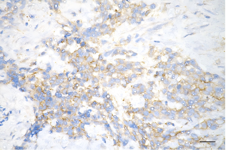 Immunohistochemistry was performed on paraffin-embedded human breast carcinoma using ARPC2 antibody. Antigen retrieval was done in sodium citrate buffer (pH 6.0). DAB was used for detection, with hematoxylin counterstaining. Images were acquired using a Nikon Ci-L Plus microscope (40× objective). Scale bar: 25 μm.