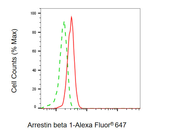 • Flow cytometric analysis of Arrestin beta 1 expression in HepG2 cells using Arrestin beta 1 antibody. Green, isotype control; red, Arrestin beta 1.