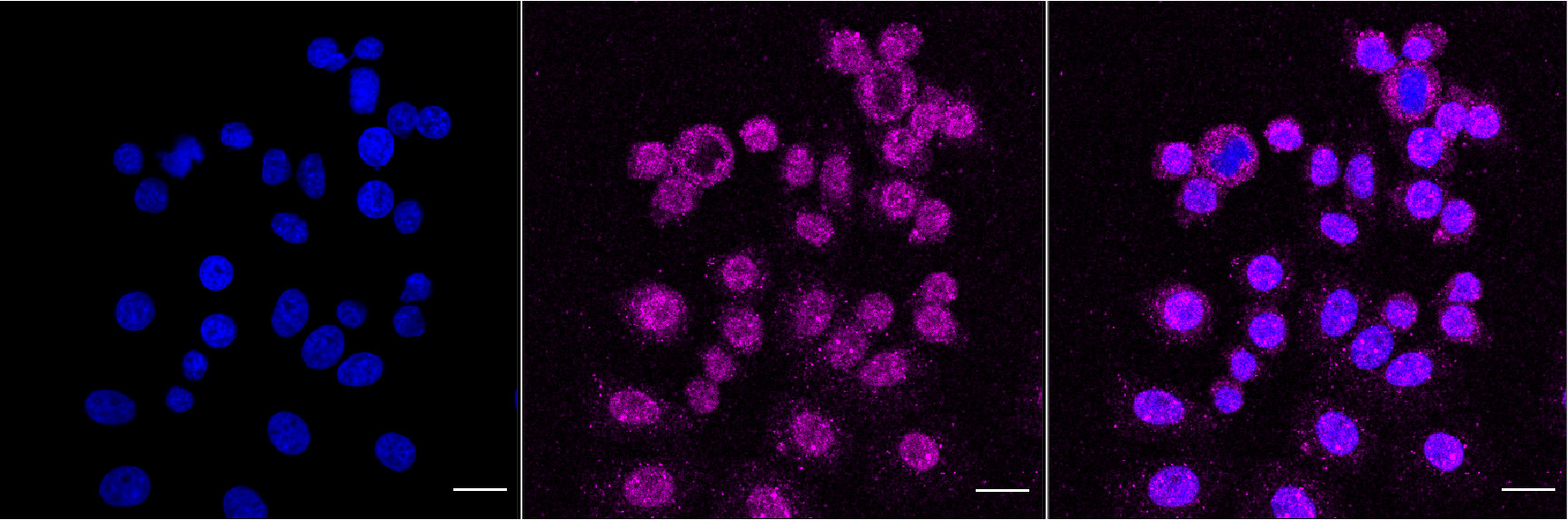 • Immunocytochemical staining of HepG2 cells with Arrestin beta 1 antibody. Nuclei were stained blue with DAPI; Arrestin beta 1 was stained magenta with Alexa Fluor? 647. Images were taken using Leica stellaris 5. Protein abundance based on laser Intensity and smart gain: Medium. Scale bar, 20 μm.