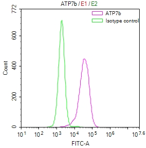 Overlay Peak curve showing HepG2 cells stained with CSB-RA175460A0HU (red line) at 1:50. The cells were fixed in 4% formaldehyde and permeated by 0.2% TritonX-100. Then 10% normal goat serum to block non-specific protein-protein interactions followed by the antibody (1μg/1*106cells) for 45min at 4℃. The secondary antibody used was FITC-conjugated Goat Anti-rabbit IgG(H+L) at 1:200 dilution for 35min at 4℃.Control antibody (green line) was rabbit IgG (1μg/1*106cells) used under the same conditions. Acquisition of >10,000 events was performed.
