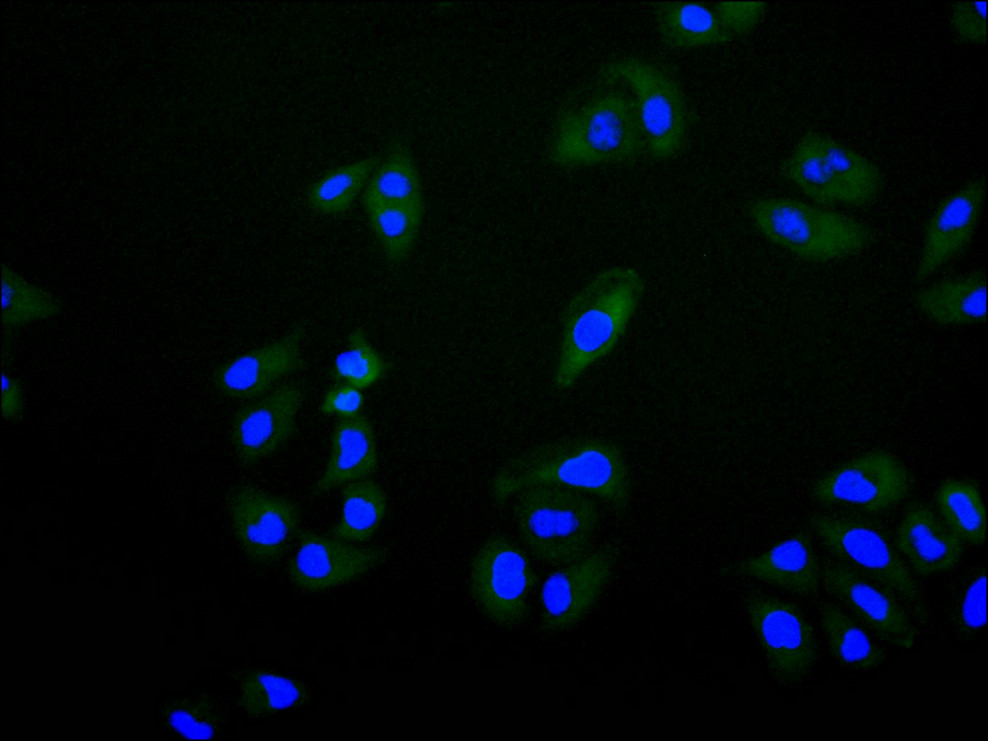 Immunofluorescence staining of HeLa cell with CSB-RA981258A0HU at 1:50 , counter-stained with DAPI. The cells were fixed in 4% formaldehyde, permeabilized using 0.2% Triton X-100 and blocked in 10% normal Goat Serum. The cells were then incubated with the antibody overnight at 4°C. The secondary antibody was Alexa Fluor 488-congugated AffiniPure Goat Anti-Rabbit IgG(H+L).