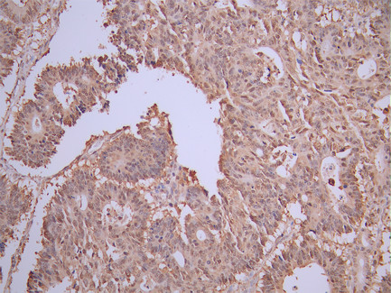 IHC image of CSB-RA981258A0HU diluted at 1:100 and staining in paraffin-embedded human colorectal cancer performed on a Leica BondTM system. After dewaxing and hydration, antigen retrieval was mediated by high pressure in a citrate buffer (pH 6.0). Section was blocked with 10% normal goat serum 30min at RT. Then primary antibody (1% BSA) was incubated at 4°C overnight. The primary is detected by a Goat anti-rabbit polymer IgG labeled by HRP and visualized using 0.05% DAB.