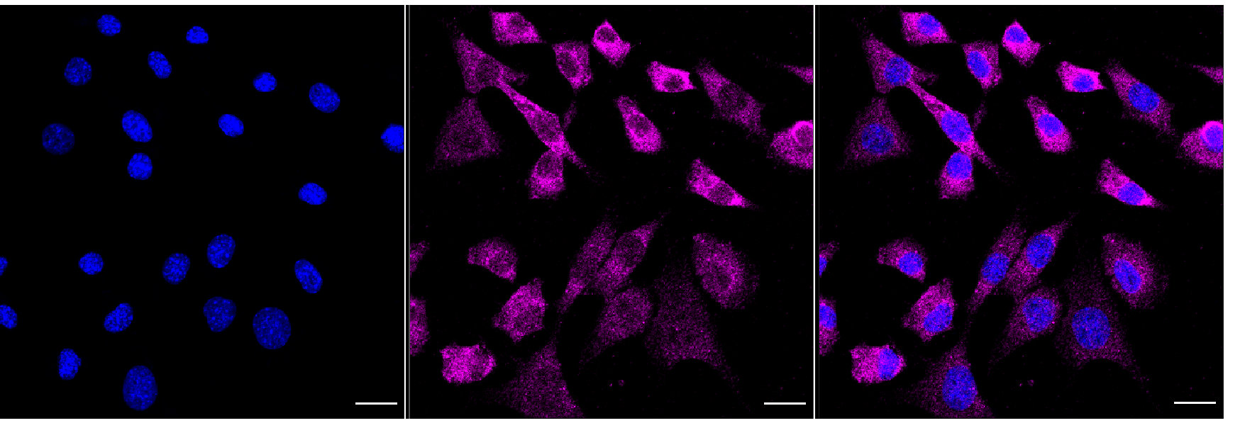Immunocytochemical staining of C2C12 cells with BAG1 antibody. Nuclei were stained blue with DAPI; BAG1 was stained magenta with Alexa Fluor? 647. Images were taken using Leica stellaris 5. Protein abundance based on laser Intensity and smart gain: Medium. Scale bar, 20 μm.