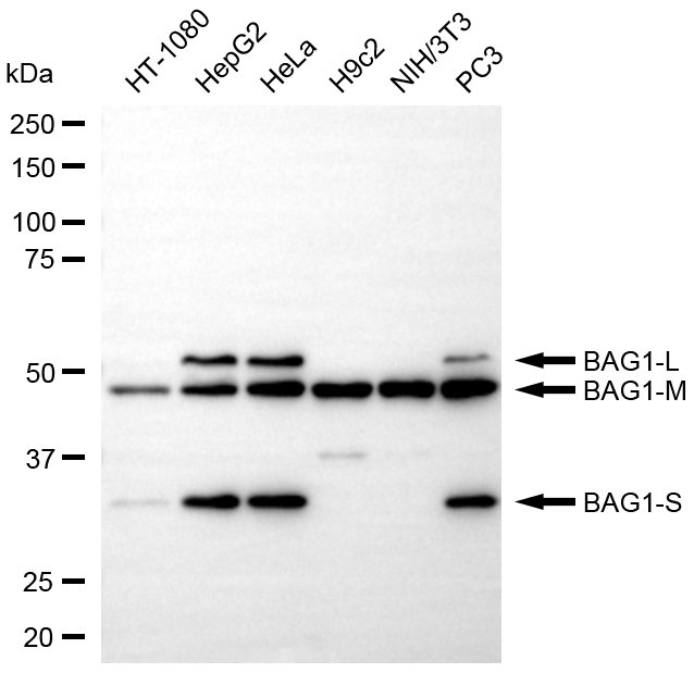 Western blotting analysis using BAG1 antibody. Total cell lysates (30 μg) from various cell lines were loaded and separated by SDS-PAGE. The blot was incubated with BAG1 antibody and HRP-conjugated goat anti-rabbit secondary antibody respectively.